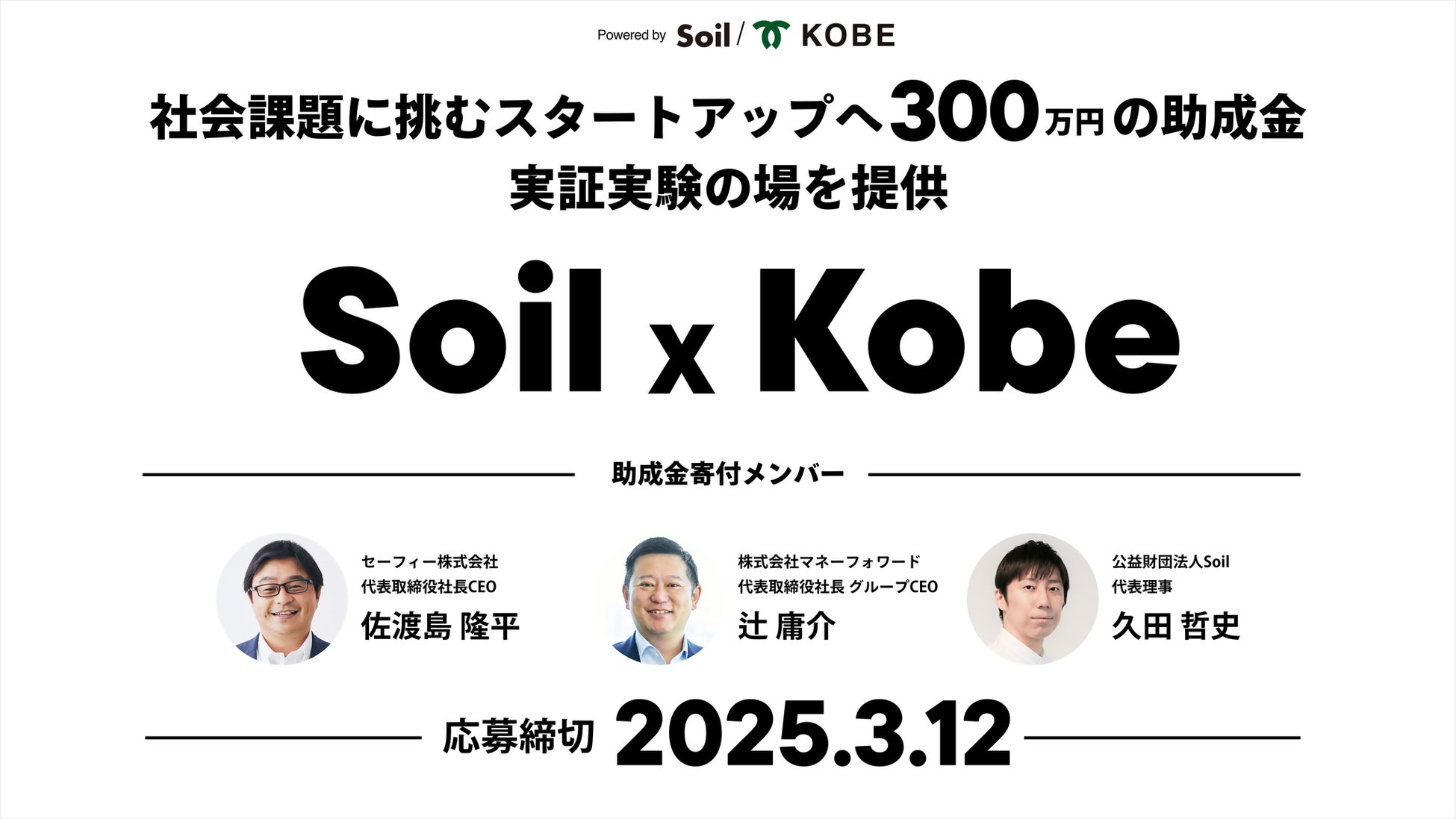 その一環として、この度、公益財団法人Soilと連携し、社会課題解決に向けた助成プログラム「Soil x Kobe」を開始することを発表します。本プログラムは、社会的意義のある活動を行っている団体や個人を対象に、最大300万円の資金助成に加え、実証実験(PoC)を実施するための連携先を紹介し、さらなる活動の拡大を支援することを目的としています。