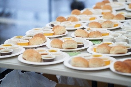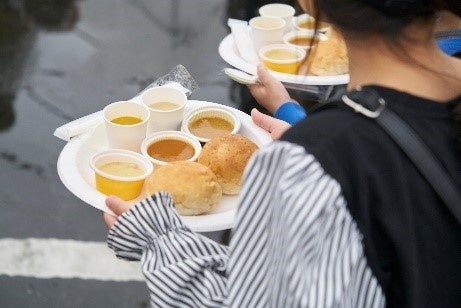 ニシキヤキッチン感謝祭一番の目玉企画である、「無料試食会」では、ニシキヤキッチン1番人気の「レモンクリームチキンカレー」と、王道の「ビーフカレー」、インドカレーの「バターチキンカレー」の3種のカレーと、「コーンポタージュ」と「クラムチャウダー」のスープ2種、パン2個をワンプレートにして、ご来場いただいた方々に配られました。