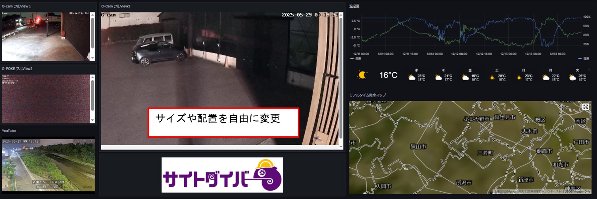 ユーザーは、メニューからG-cam/G-POKEパネルを選ぶだけで、サイトダイバーのダッシュボードにG-cam/G-POKEの映像を追加し、パネルのサイズや配置を自由に変更することができます。