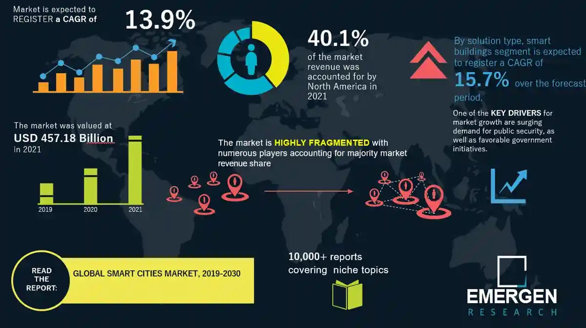 本レポートでは、エマージェン・リサーチがソリューションの種類、用途、地域に基づいて世界のスマートシティ市場をセグメント化しました。