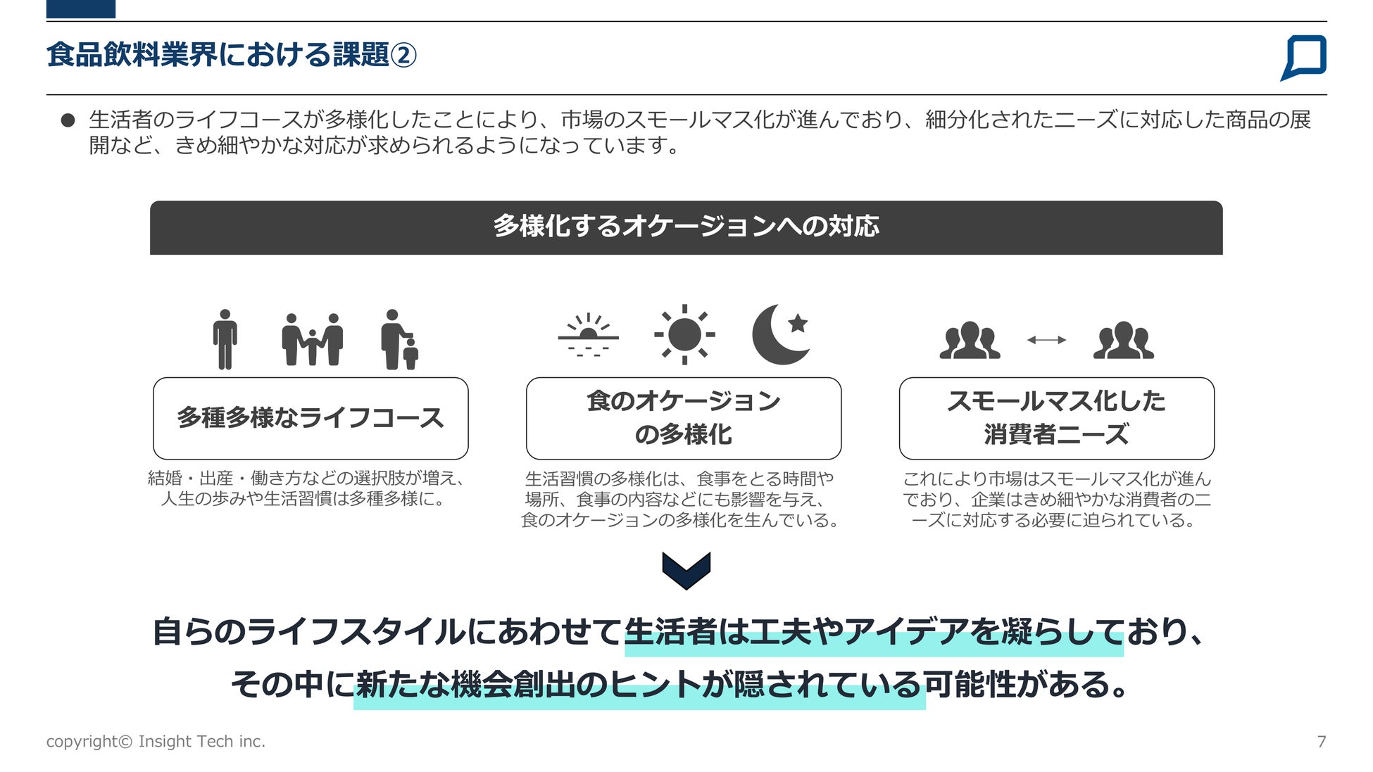 ◆食品飲料業界における特有の課題として、「食の安全・健康意識の高まり」「多様化するオケージョンへの対応」「商品開発サイクル/コミュニケーションサイクルの高速化」などが挙げられます。