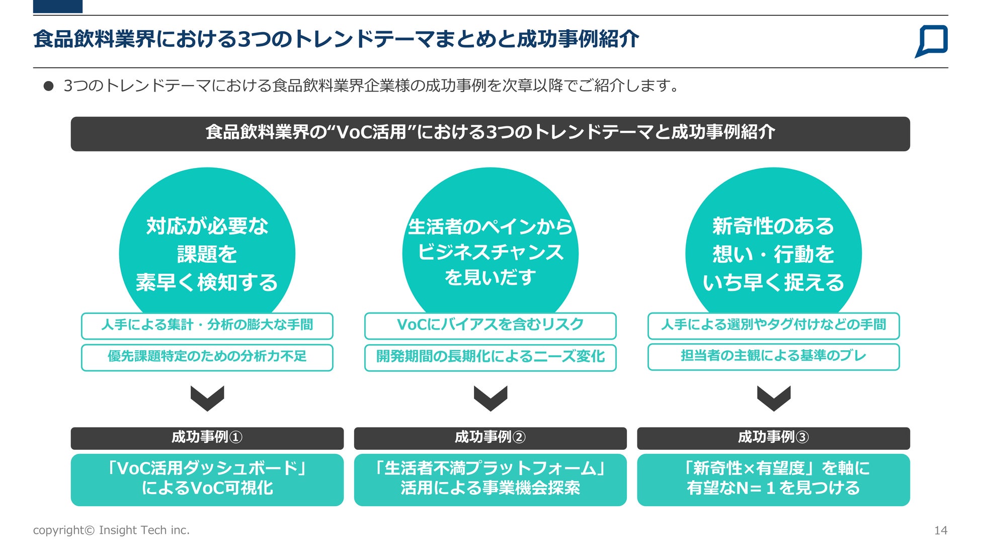 このような中で日々VoC活用と向き合われている皆さまが、いま取り組むべき3つのテーマをピックアップし、それぞれについて対応の方向性と実際の成功事例をご紹介しています。