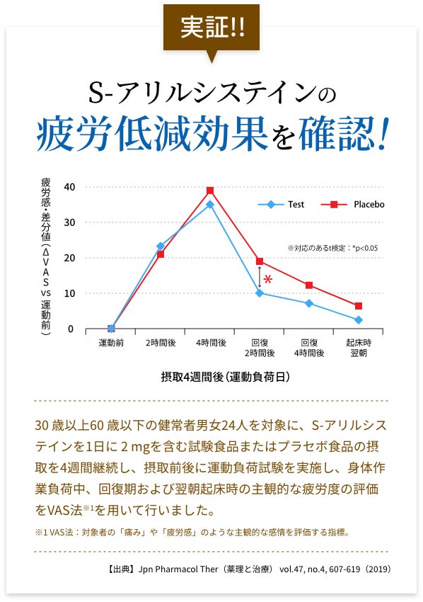 1日2mgのS-アリルシステインを4週間継続摂取し、摂取前後に運動負荷試験を実施したところ、身体作業負荷中、回復期および翌朝起床時の疲労感低減効果が確認されました。