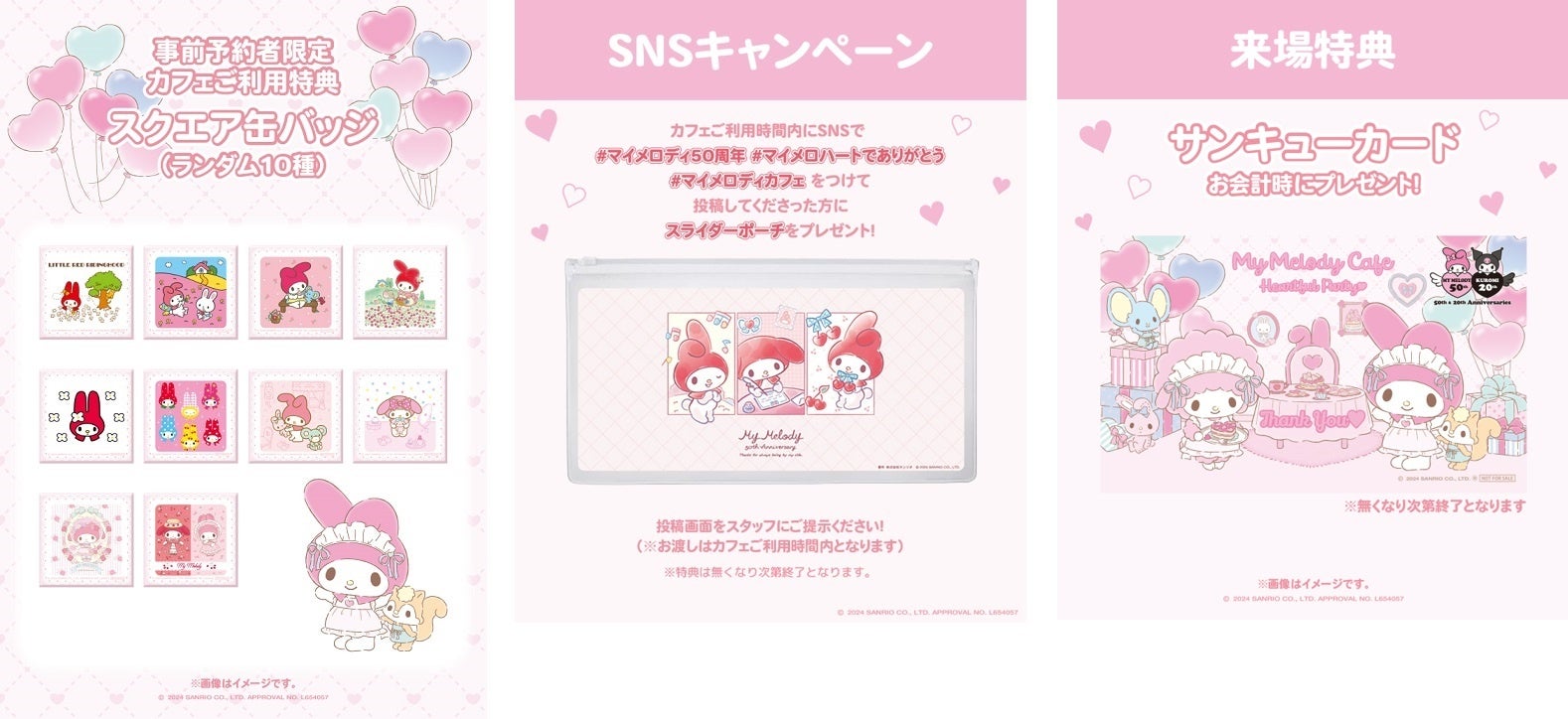 ■SNSキャンペーン:カフェご利用時間内にSNSで♯マイメロディ50周年、♯マイメロハートでありがとうをつけて投稿してくださった方に「スライダーポーチ(全1種)」をプレゼント。