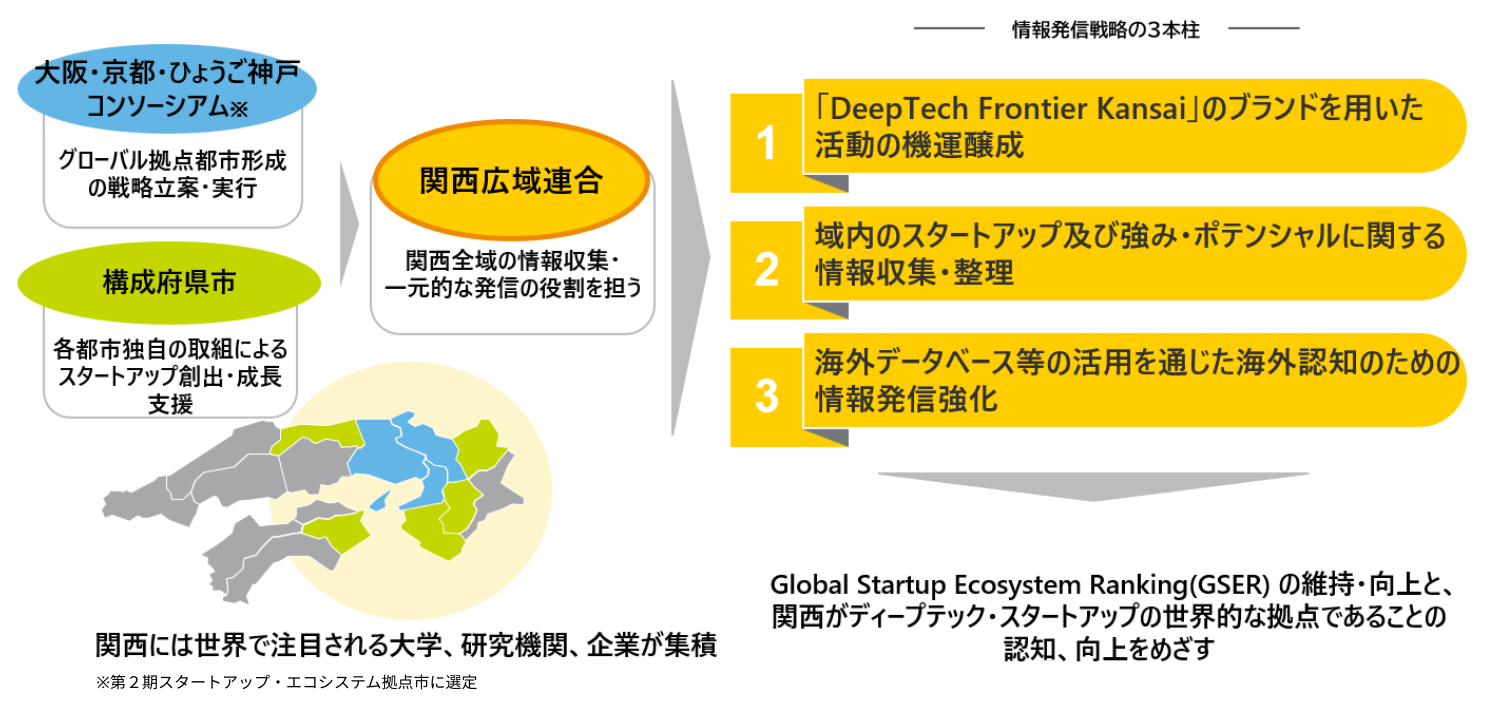 本戦略では、以下の3つを柱として、関西全域のスタートアップ情報の国内外への発信の強化を図ります。