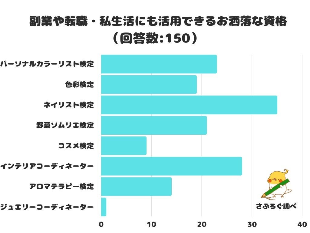2位以降は、「インテリアコーディネーター」、「パーソナルカラーリスト検定」と続き、「ジュエリーコーディネーター」は8位という結果になりました。