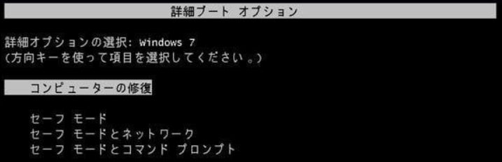 1、パソコンを再起動して適切なタイミングで「F8」キーを連打して詳細ブートオプションを起動した後、「コンピューターの修復」を選択します。