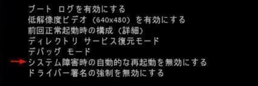 2、「システム障害時に自動再起動を無効にする」を選択し、「Enter」キーを押します。