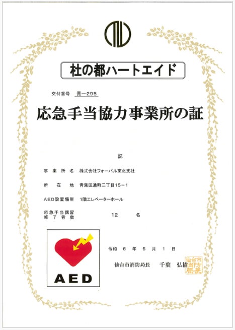 フォーバル東北支社が『杜の都ハートエイド』に 参画 宮城県仙台市の応急手当協力事業所に認定