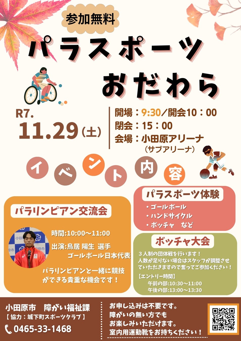 パラスポーツを通じて、パラスポーツの楽しさを実感してもらうとともに、多くの人に障がいについて理解してもらうことを目的に「パラスポーツおだわら」を開催します。