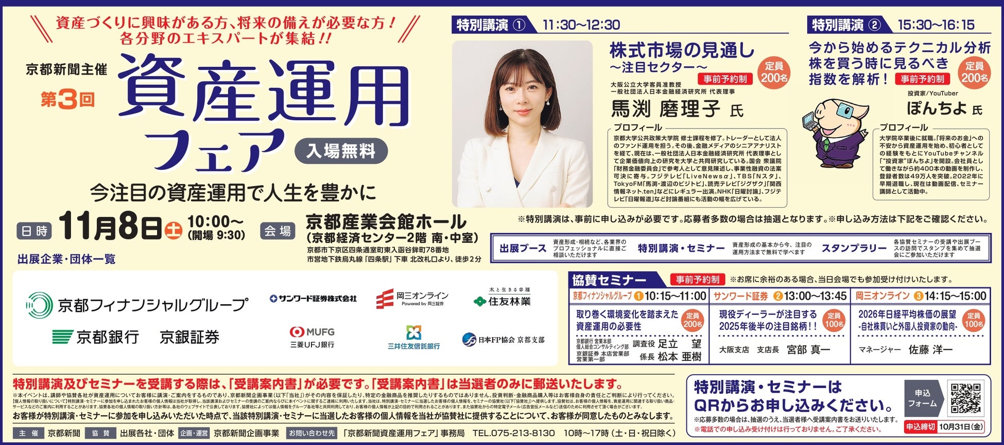 京都新聞では、ライフスタイルが多様化する中で、資産づくりに興味がある方、将来の備えが必要な方を対象とした「第3回資産運用フェア」を11月8日(土)に京都経済センター2階 京都産業会館ホールで開催いたします。いま注目の資産運用で人生をより豊かにしてみませんか。
