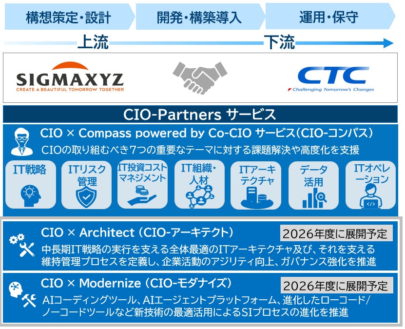 伊藤忠テクノソリューションズ株式会社(代表取締役社長:新宮 達史、本社:東京都港区、略称:CTC)は、株式会社シグマクシス(代表取締役社長:太田 寛、本社:東京都港区、以下 シグマクシス)と連携し、企業の最高情報責任者(CIO:Chief Information Officer)に向けて、企業の戦略立案から実行までを一気通貫で伴走支援する「CIO-Partnersサービス」の提供を開始します。本サービスは、3つのオファリングから構成されており、第1弾として「CIO × Compass powered by Co-CIO サービス(CIO-コンパス)」を展開します。