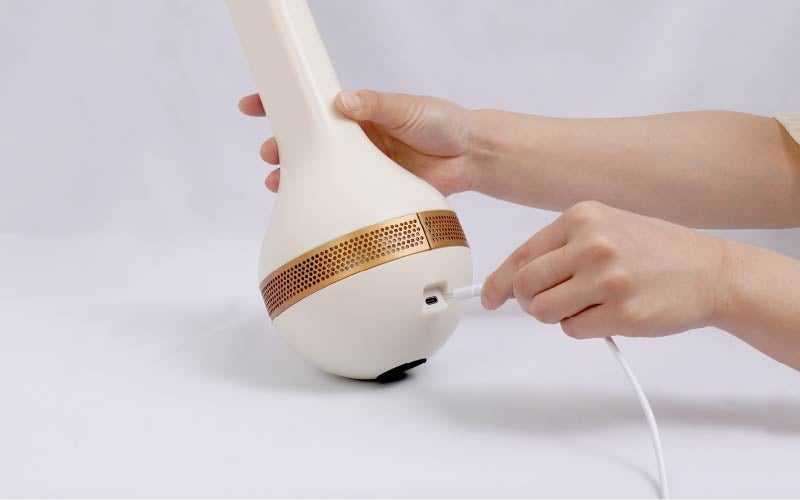 USB給電式。土台部分の電源ボタンで、電源ON、風量強弱2段階切り替えが可能。