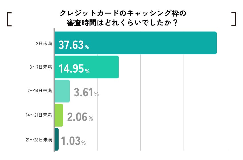 キャッシング枠の審査時間は「3日未満」が約38%、「3~7日未満」が約15%。各項目を合計すると、「1週間未満」が過半数を占める結果となった。
