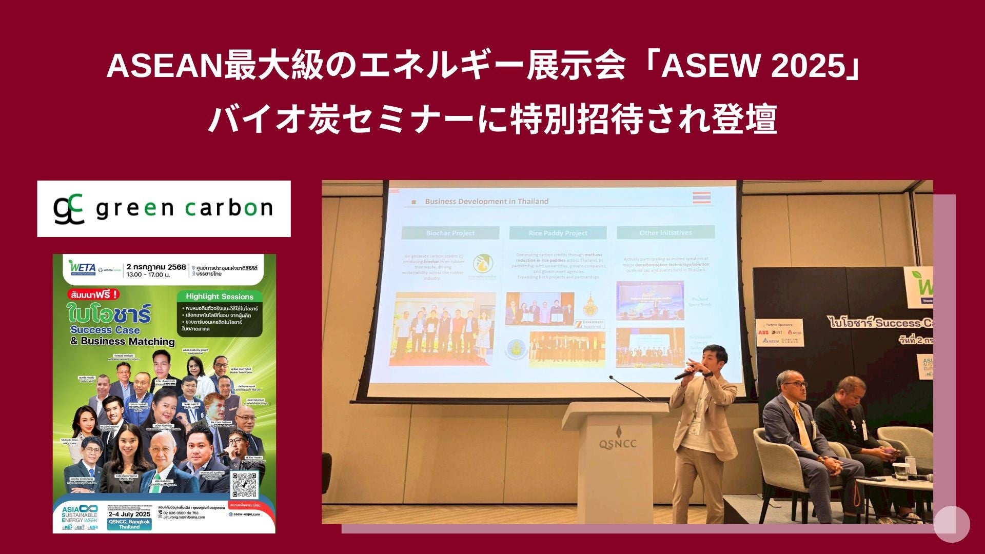 Green Carbon株式会社は、ASEAN最大級のエネルギー展示会「ASEW 2025」内のバイオ炭セミナーに特別招待され登壇