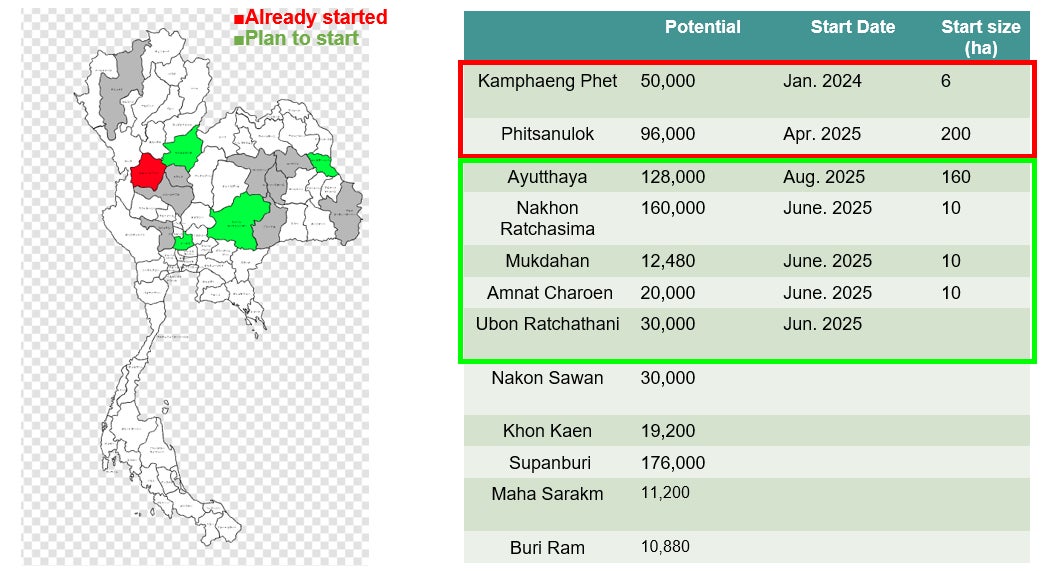 また、タイ王国では現在、農業分野の温室効果ガス排出、特に稲作由来のメタン排出が国家の気候変動対策の最重要課題のひとつと位置づけられています。TGO(タイ温室効果ガス管理機構)によるPremium T-VER制度や、農業・協同組合省(MoAC)によるAWD技術の普及強化により、水田を起点とした脱炭素モデルの構築が国家レベルで加速しています。今後は、Phitsanulok、Ayutthaya、Nakhon Ratchasima、をはじめとする農業主要県において、段階的な拡大を進め、150万ha規模を目指します。タイ国内外の投資家・企業・政府機関との協調を通じて、アジア最大級の水田由来脱炭素プロジェクトを組成してまいります。
