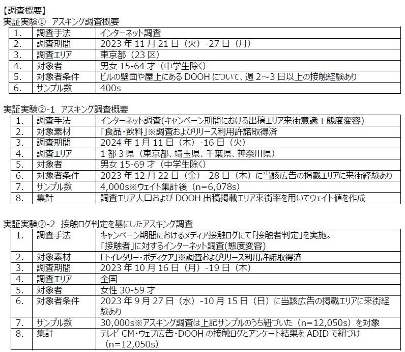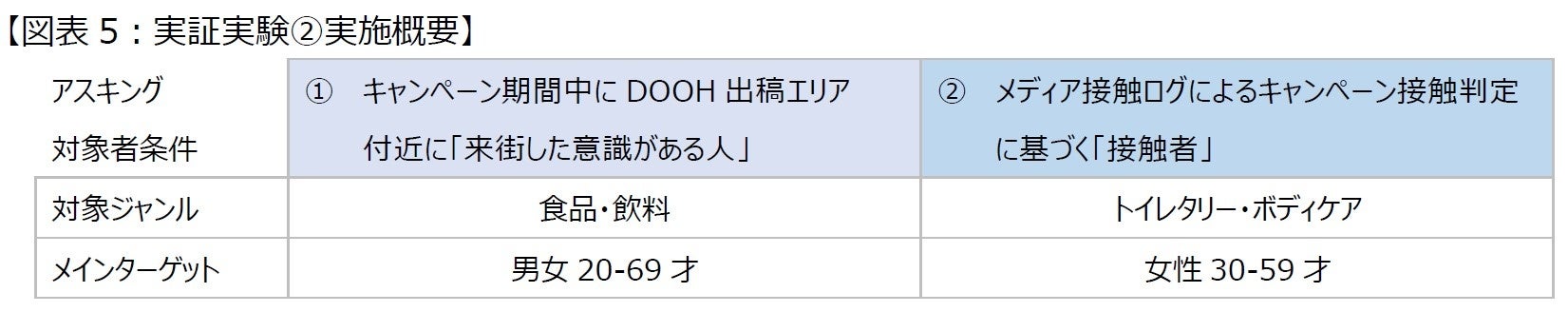 実証実験②では、DOOHを含むトリプルメディア広告効果検証について、2つの広告キャンペーンの実例を用いて「キャンペーン期間中にDOOH出稿エリア付近に来街した人」を、スクリーニング調査で判定したアスキング調査とメディア接触ログ*6で判定したアスキング調査の2パターンで検証を行いました。(図表5)