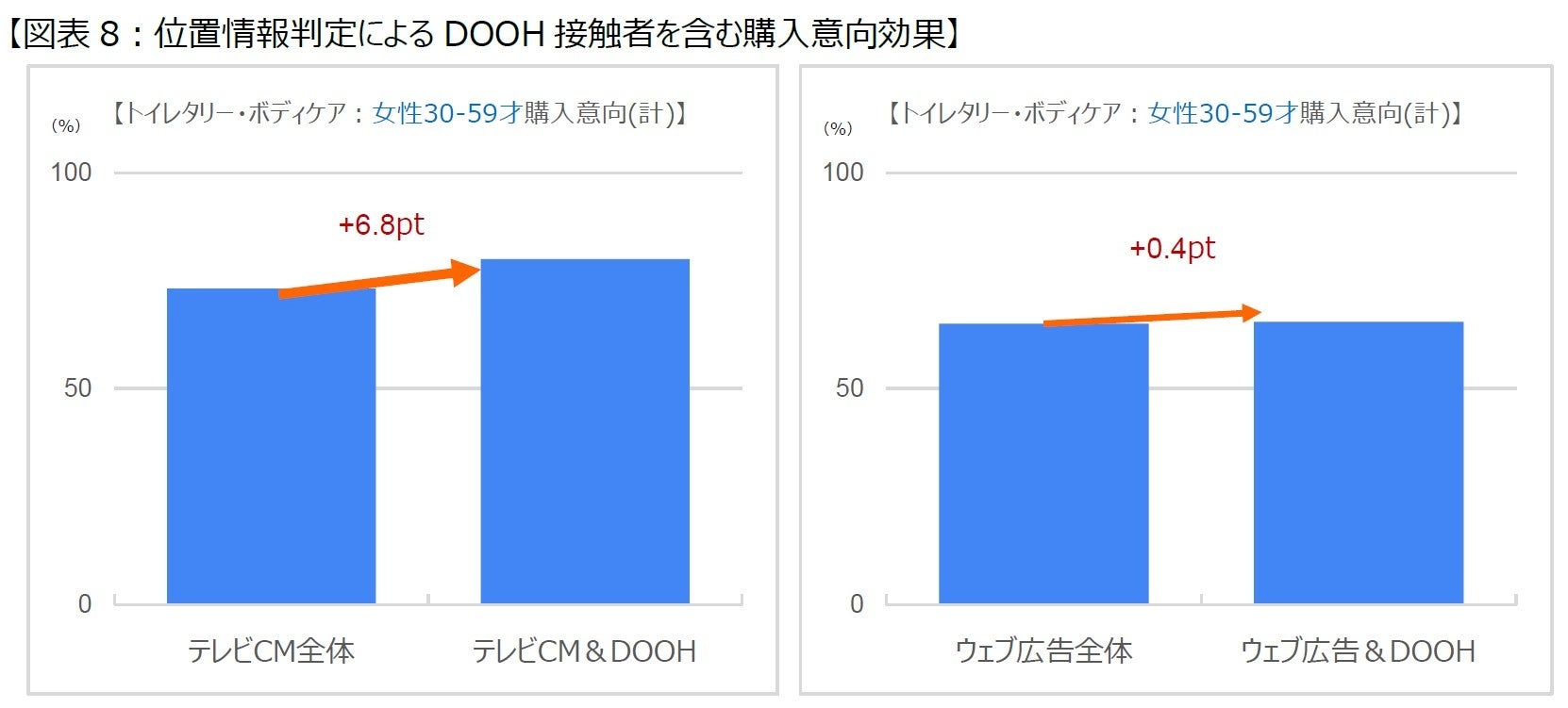 さらに、位置情報による接触者判定を行った「トイレタリー・ボディケア」のアスキング調査結果においても「DOOH接触者」を含んでいる方が「購入意向」が高くなっており、「DOOH」の効果を裏付ける結果が得られています。(図表8)
