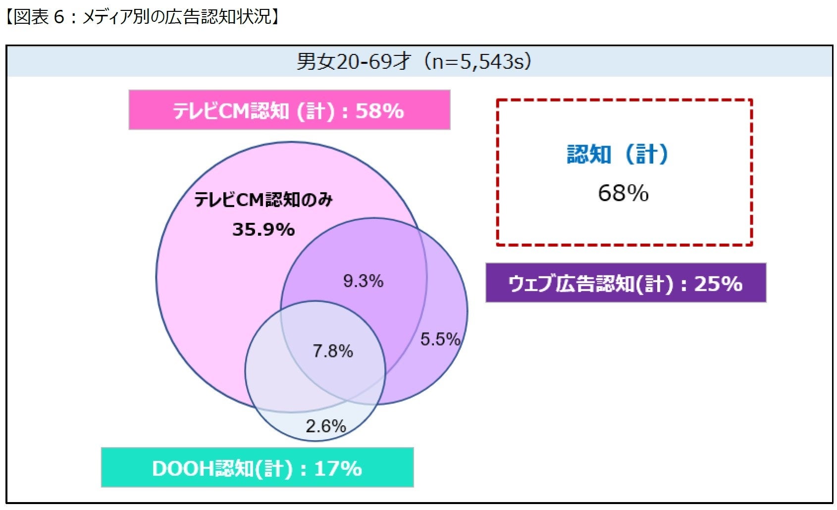 まず、「食品・飲料」について広告認知をメディア別で確認した場合、今回のキャンペーン全体の認知は68%、DOOH認知者は全体で17%。約3%はDOOHのみで広告キャンペーンを認知しており、トップファネルを補完する効果が確認できています。(図表6)