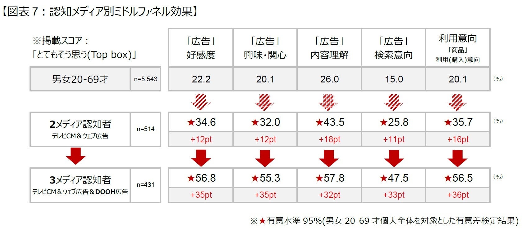 メディアミックス効果では「DOOH含むトリプルメディア」のミドルファネル効果が顕著
