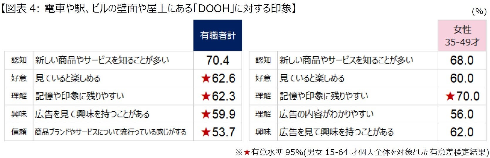 さらに、「DOOH」に対する印象を聴取したアスキング調査結果では、外出が多く見込まれる「有職者」や「女性35-49才」などにおいて、ミドルファネル*5に対する効果も明らかになっています。(図表4)