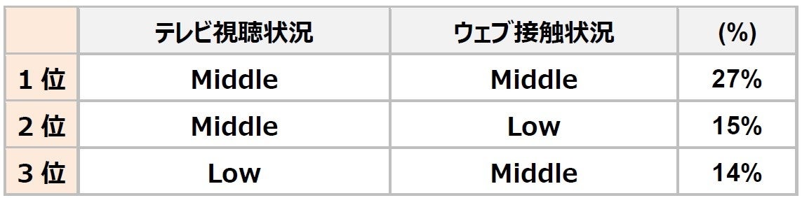 実証実験①では、LIVE BOARDが保有する位置情報*1とビデオリサーチの生活者大規模調査であるACR/ex*2調査のプロフィールを付与したテレビ接触ログの連携*3を行い、LIVE BOARDの媒体20面付近を移動していた“人”を「DOOH接触者」と定義し、特徴を検証しました。「DOOH接触量が多い人(2023年6月に複数面のDOOH広告および、2キャンペーン以上に接触している人)」における、「テレビ」と「ウェブ」の接触状況を見た場合、最も多かったのは「テレビ接触(Middle)」と「ウェブ接触(Middle)」といった、Middle(ミドル)レベルの組み合わせとなっています(今回のテレビ・インターネットにおける接触時間量定義*4:各接触時間量の多い順にHigh20%・Middle50%・Low30%に分類)。また、2番目、3番目に多かった接触状況についても接触時間量が多い(High)は含まれておらず、DOOHがテレビやウェブで比較的到達が難しい生活者へのリーチ手段として効果的となる可能性がうかがえます。(図表1)