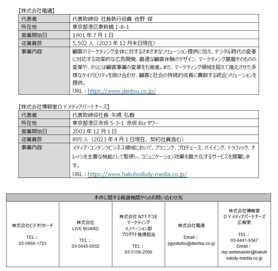 電通が提供する、ユーザーの同意許諾を得たテレビメーカー由来の視聴データに基づくデジタル広告配信・効果検証が可能な統合マーケティングプラットフォーム「STADIA」をはじめとしたテレビ・デジタルなどのメディア接触データ、LIVE BOARDが配信可能なDOOHの配信ログ、およびD2Cの広告配信ログを、ドコモが保有する基盤にて統合することで、ID単位をキーとしたデータベースとして分析可能とする、ドコモ、電通、株式会社電通デジタル、LIVE BOARD、株式会社D2Cの5社が提供するAI分析エンジンのこと。なお、「docomo data square」で使用するデータには、個人が特定されるデータは含まれていません。