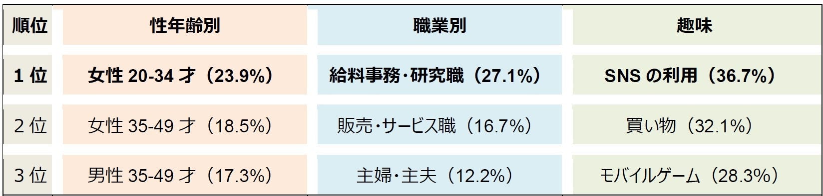 加えて、「DOOH接触量が多い人」はどのような特徴があるのかについて検証を行いました。その結果、性年齢別では「女性20-34才」、職業別では「給料事務・研究職」がそれぞれ最も多く、「趣味」で見た場合は、「SNSの利用」「買い物」「モバイルゲーム」が上位にきていました。このように、位置情報にプロフィール情報を連携することで、基本属性だけではなく、より多角的なターゲティングが可能になります。(図表2)