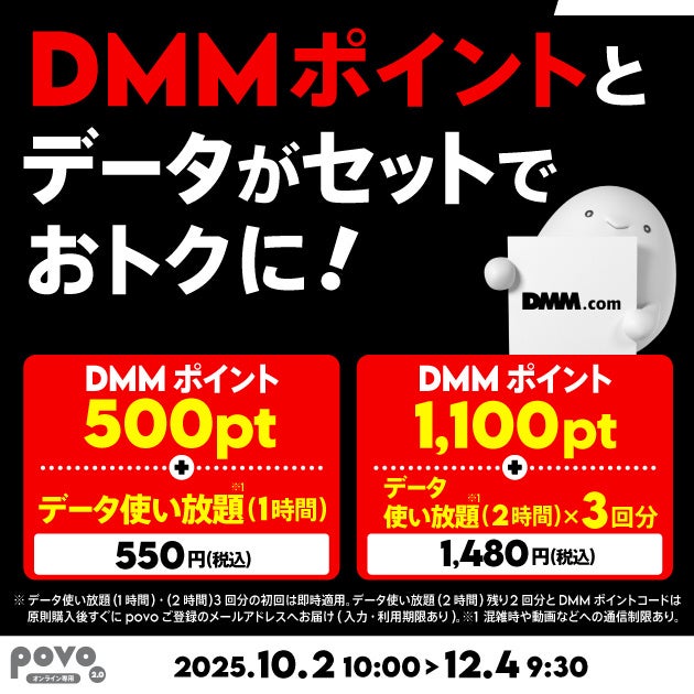 KDDI、沖縄セルラーは2025年10月2日から、povo2.0の「今だけのトッピング」として、「DMMポイント500pt」と「データ使い放題(1時間)」(注1)がセットになったトッピングを550円、DMM TV月間2カ月分相当の「DMMポイント1,100pt」と「データ使い放題(2時間)3回分」がセットになったトッピングを1,480円で提供します。
