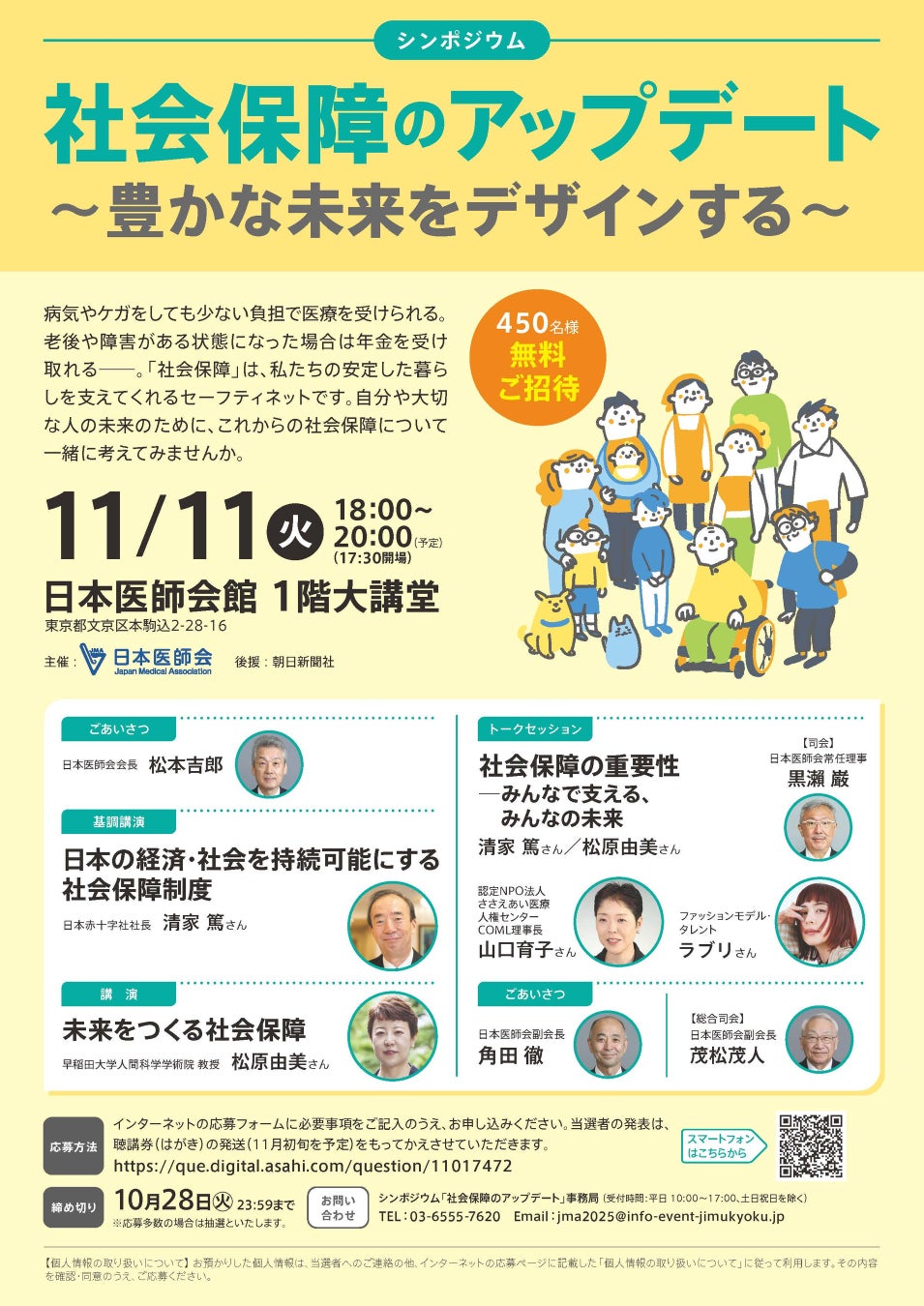 日本医師会(会長:松本吉郎)では、私達の安定した暮らしを支えてくれるセーフティーネットである「社会保障」のこれからを皆さんと一緒に考えることを目的として、シンポジウム「社会保障のアップデート~豊かな未来をデザインする~」を開催することになりました。ぜひ、ご参加願います。