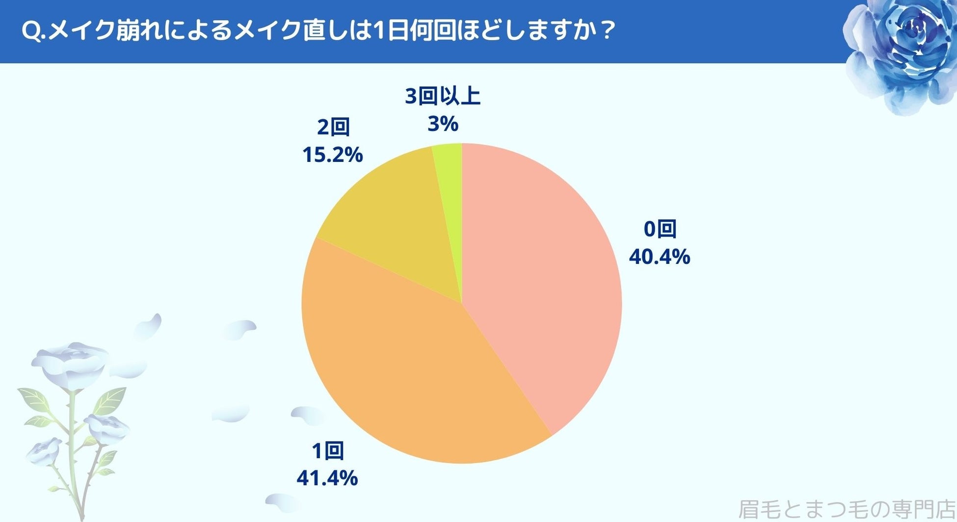 メイク崩れによるメイク直しの回数をお聞きしたところ「0回(40.4%)」、「1回(41.4%)」、「2回(15.2%)」、「3回以上(3%)」という結果になりました。