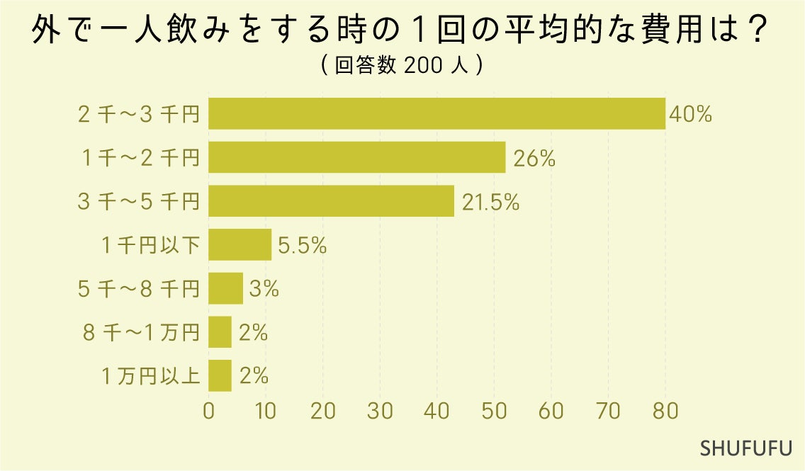 外で一人飲みをする時の1回の平均的な費用では「2千〜3千円」が最多でした。ちょっとしたおつまみとお酒が数杯楽しめる値段くらいでしょうか。