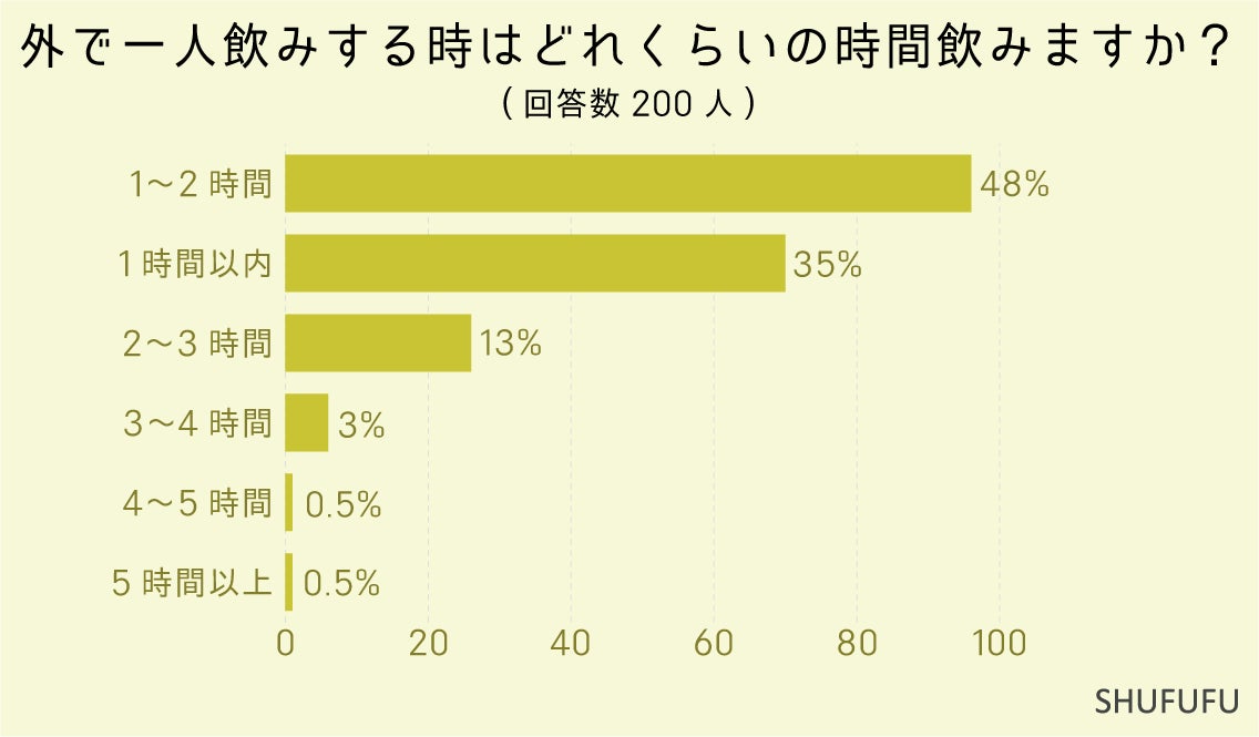 外で一人飲みする時はどれくらいの時間飲むかに関しては1位「1〜2時間(48%)」、2位「1時間以内(35%)」でした。80%以上の人が2時間以内で飲み終えると回答していました。