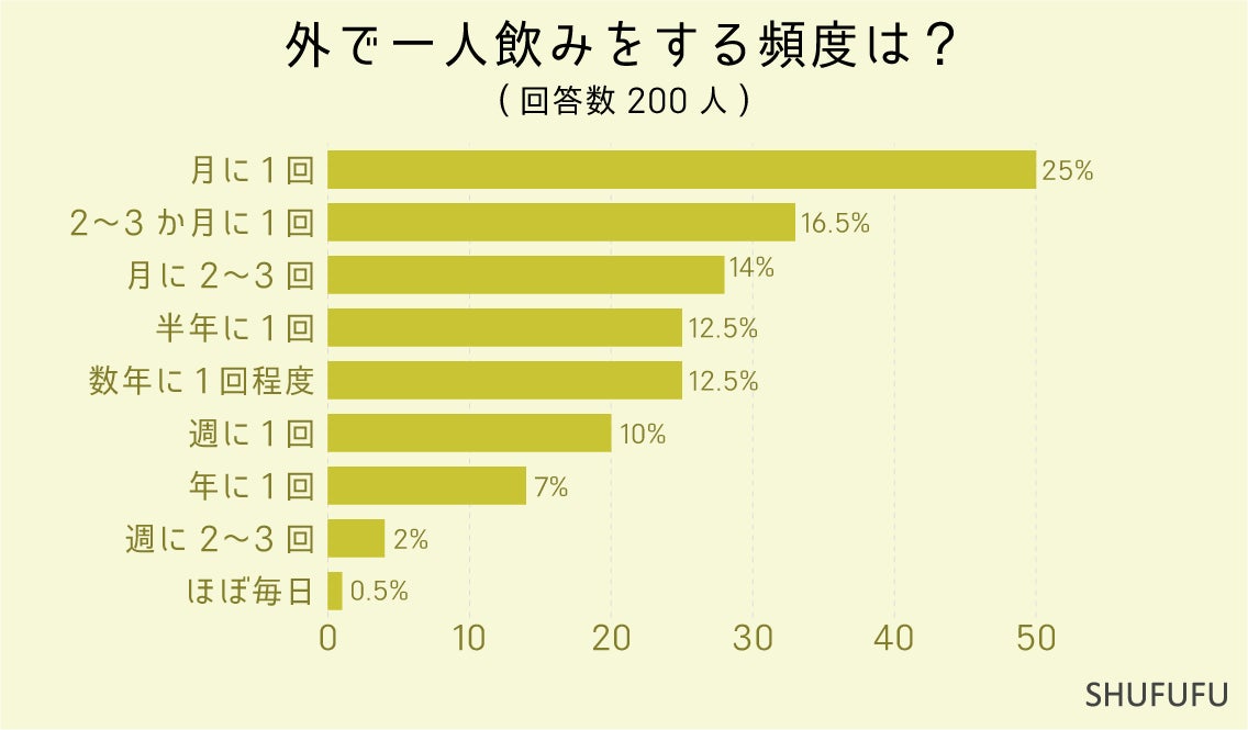 外で一人飲みをする頻度では「月に1回」と答える方が1番多かったです。1/4の回答数になりました。