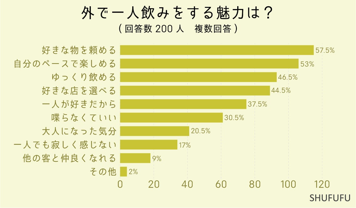 外で一人飲みをする魅力を尋ねたところ、1位は「好きな物を頼める(57.5%)」、2位「自分のペースで楽しめる(53%)」となりました。他の人に気を遣わなくて済むという点が上位の選択肢の共通点になりました。