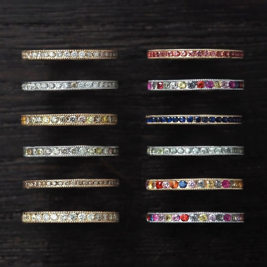 ダイヤモンドはホワイト・ブラウン・イエローの3種、サファイアは単色からミックスカラーまで幅広くご用意。サイズは1.0mm/1.3mm/1.6mmの3種類、地金はK9イエローゴールドに加え、シリーズでは珍しいK10ホワイトゴールドもご用意しています。