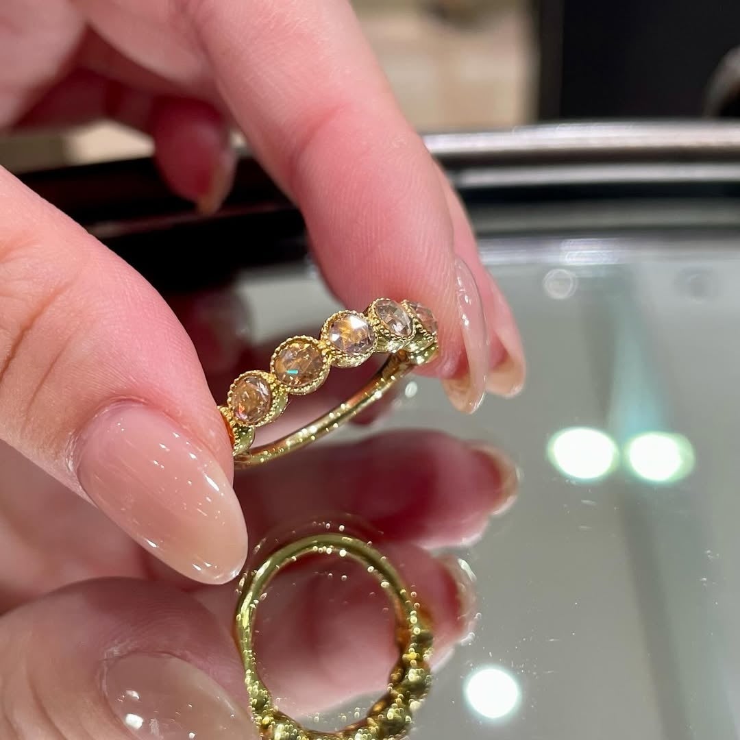 ミルゴシックシリーズの象徴である、極小の粒を一つひとつ手作業で施した「ミル打ち」。今回の“レール”では、宝石を爪ではなく金属のレールで上下から挟み込む「レール留め」の縁に、このミル打ちが施され、石の輝きをより一層引き立てています。横一列に整然と並んだ宝石と繊細な装飾が、ジュエリーに静かな存在感を与えます。