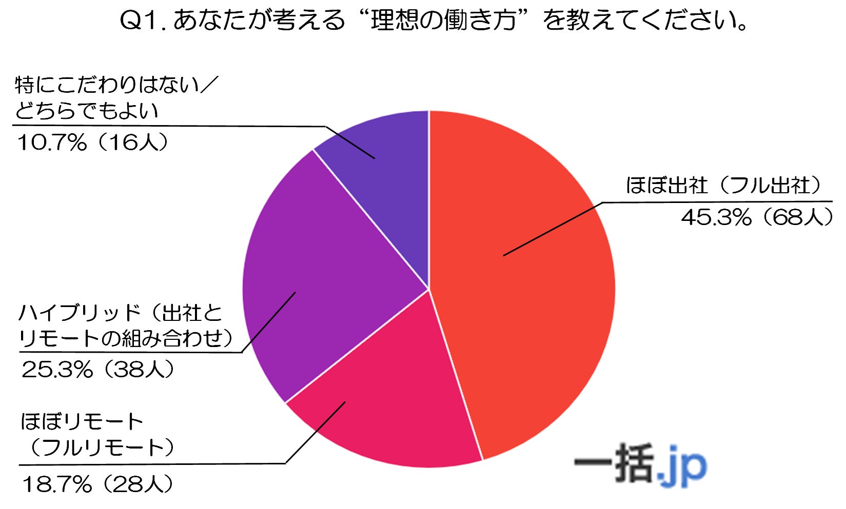 今回の調査では、「ほぼ出社(フル出社)」を理想と考える人が45.3%(68人)と最も多く、出社志向が根強いことが明らかになりました。