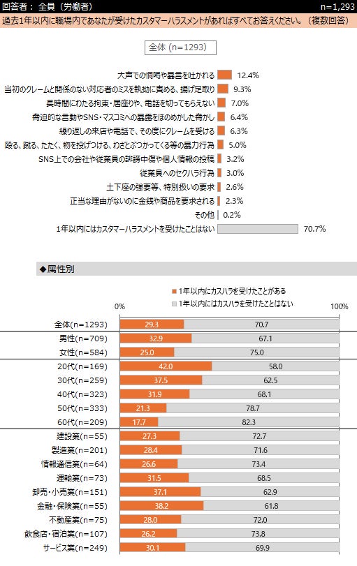 企業にお勤めの1, 293名に、カスタマーハラスメント(カスハラ)の実態について調査。