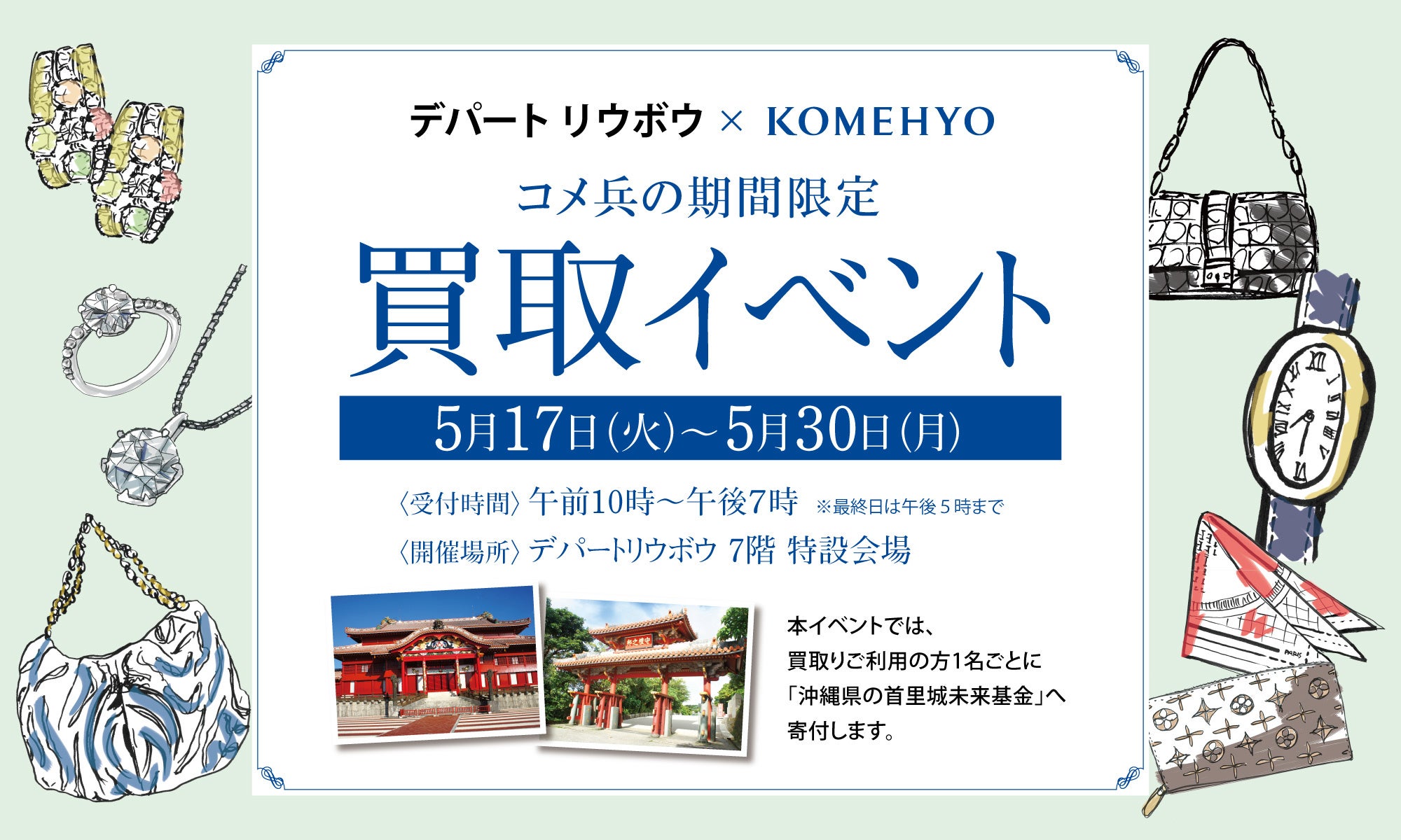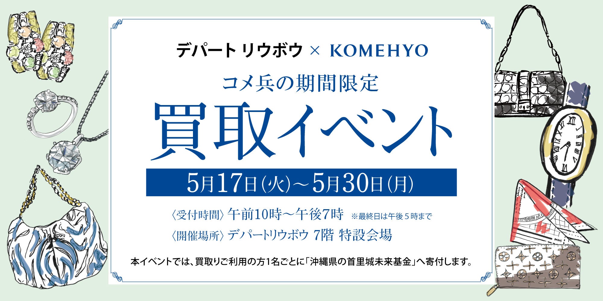 「世の中の良質を永遠につなげていく」をミッションとするリレーユースカンパニー※1 コメ兵(以下「KOMEHYO」)は、沖縄県那覇市にあるデパートリウボウにて、2022年5月17日(火)~30日(月)の期間限定で、買取イベント「KAITORI GO」を開催いたします。
