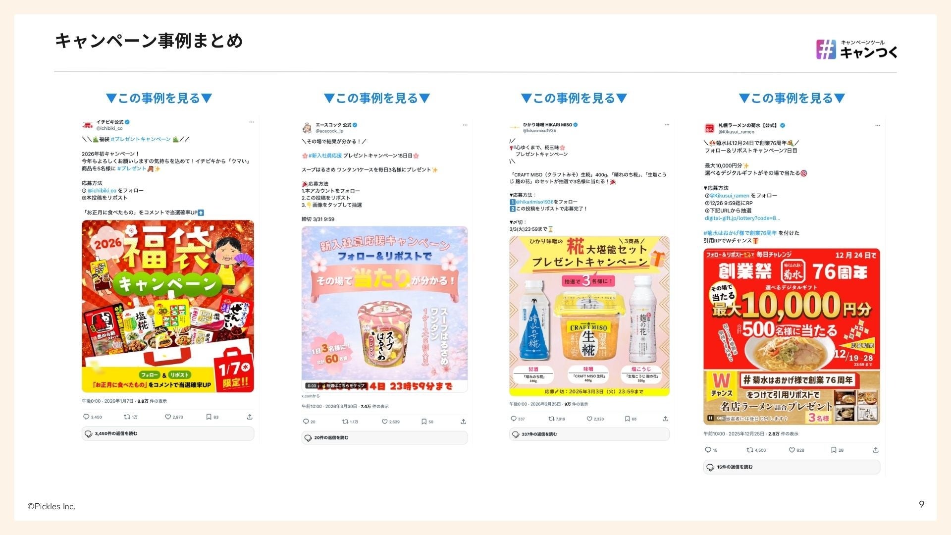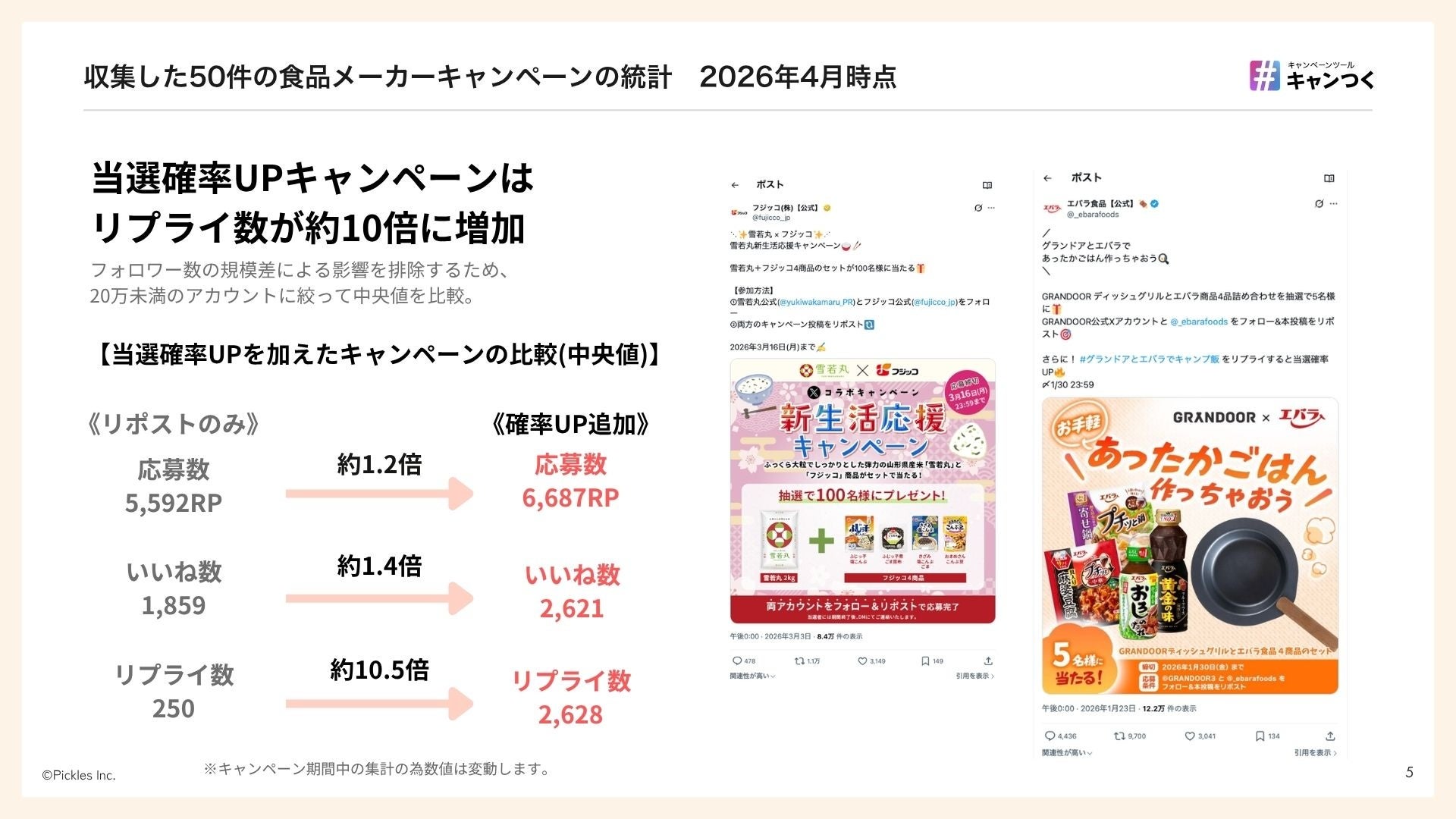 ひとりでも勝てるキャンペーンツール「キャンつく」を提供する株式会社ピクルス(東京都品川区、代表取締役 田中 稔、以下「当社」)は、無料ダウンロード資料『最新Xキャンペーン動向レポート2026』食品メーカー編を最新版に更新しました。2025年4月から2026年3月に実施された食品メーカーのXキャンペーン50件を独自調査し、代表的な28事例を掲載しています。