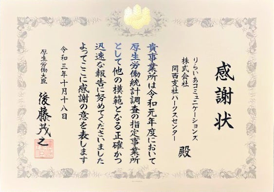 りらいあコミュニケーションズ株式会社(本社:東京都渋谷区、代表取締役社長 網野孝、以下、当社)の事業所である関西支社パークスセンターが、令和3年度厚生労働統計功労者功績表彰の対象事業所として表彰されました。