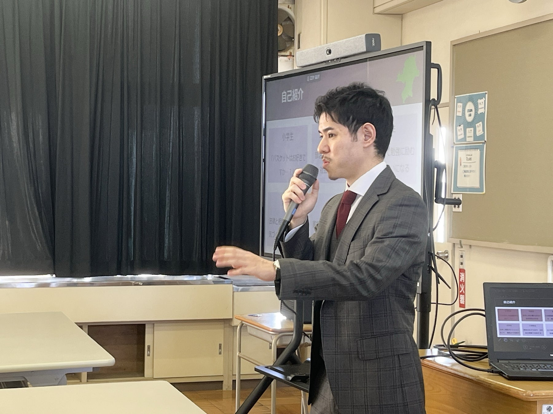 「職業講話会」とは、中学生が各業界の職業人からの話を通じ、 将来の進路選択や職業に対する理解を深めるために行われているイベントです。今回はアディーレから力久翔太弁護士が登壇し、弁護士の仕事について話しました。