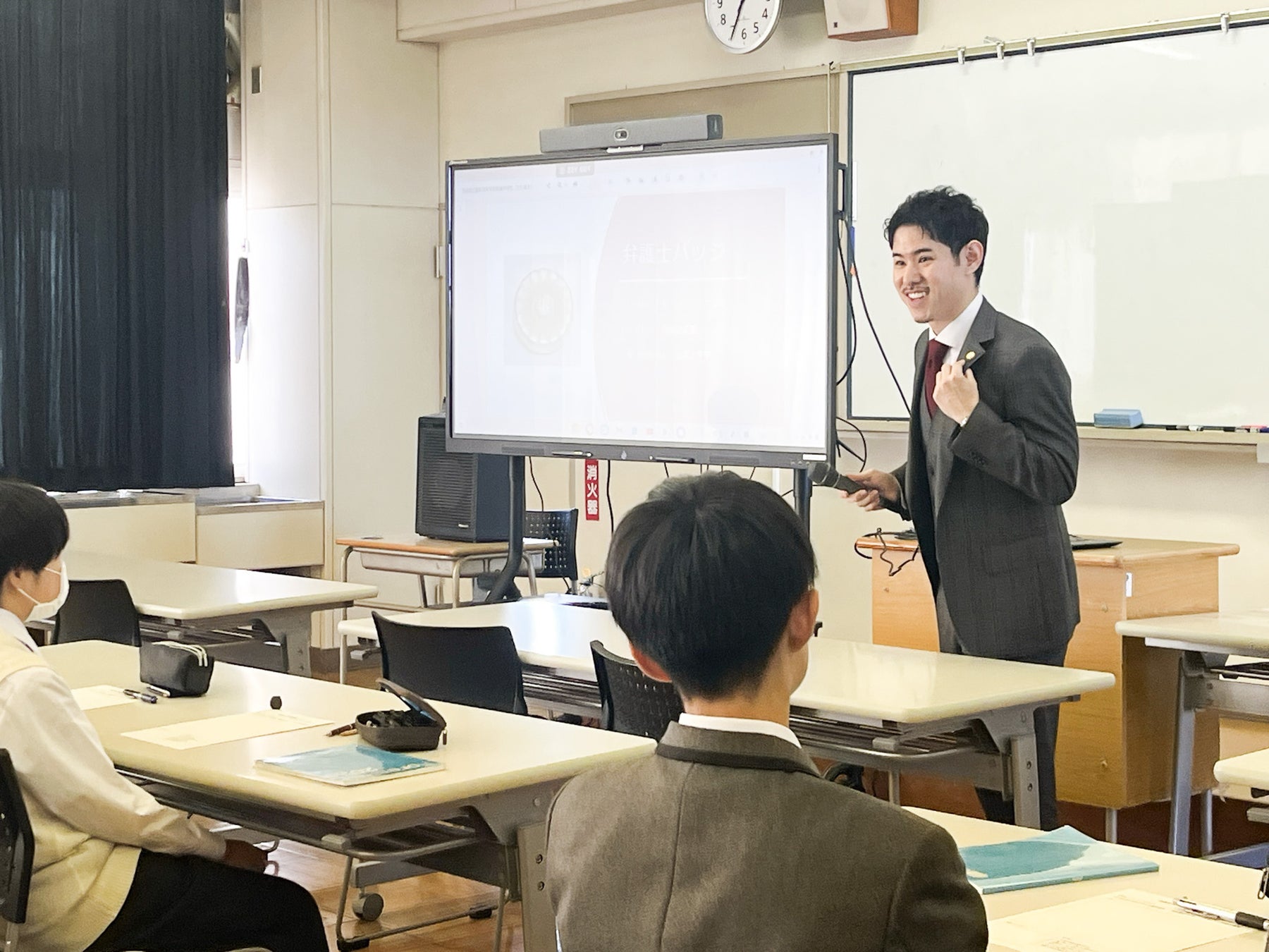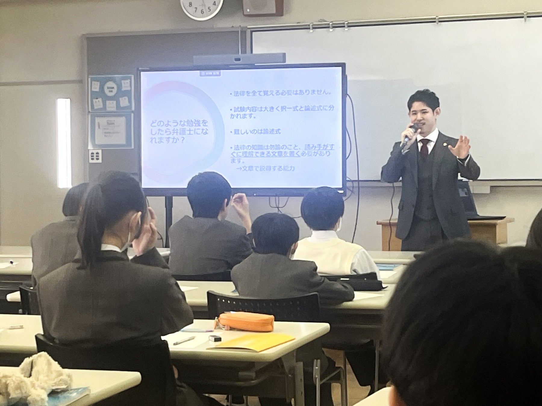 ドラマや映画で見られる弁護士のイメージとは少し違った「リアル」な実情に、生徒の皆さんも興味津々といった様子で耳を傾けていました。