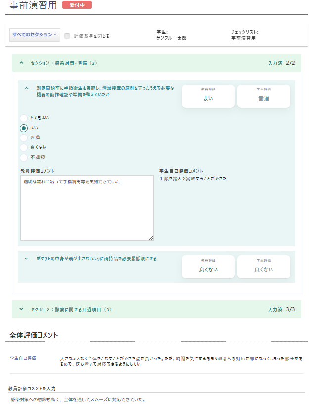 教員画面では、試験で使用するチェックリストを作成することができます。評価基準やチェック項目を自由に設定できるため、OSCEはもちろん、幅広いシーンでご活用いただけます。試験実施後は、学生一人に対して複数の教員がシステム上で同時に評価を行えるため、情報共有や評価決定の手間を低減することができます。