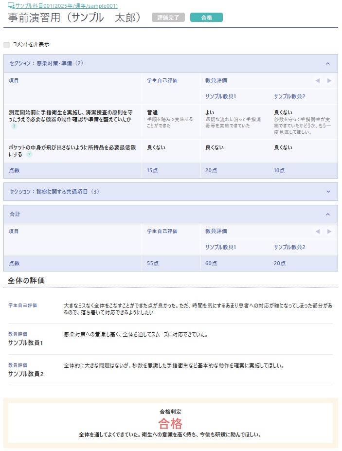 教員は、試験準備と評価をシステム上で実施でき、業務負担の削減につながります。学生側も、試験後すぐに自己評価を行えるほか、複数教員からの評価をシステム上で比較でき、学習効果の最大化やモチベーションの向上を見込めます。