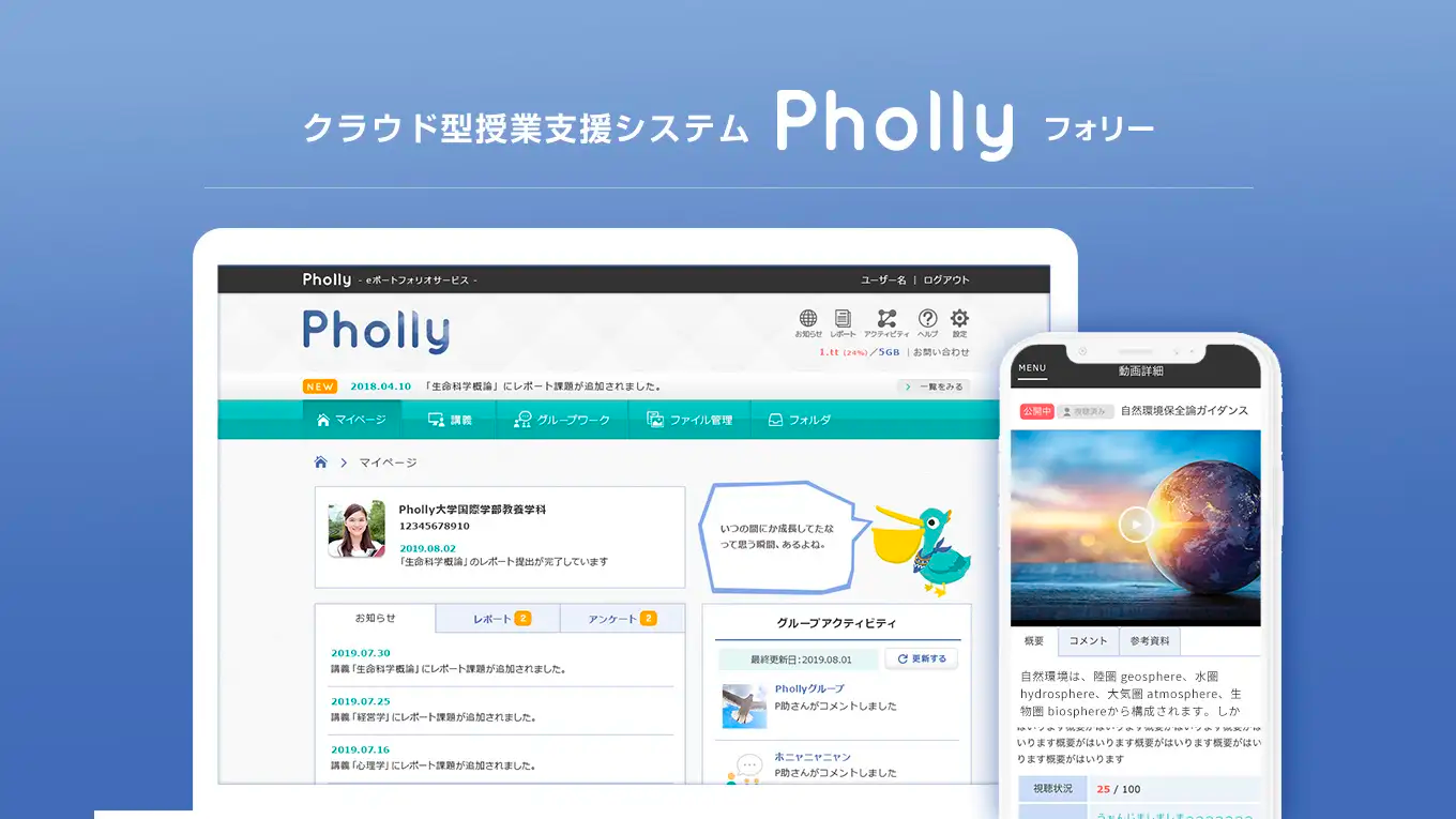 Phollyは、大学や専門学校を中心にご利用いただいている授業支援システムです。業界最安値帯の料金プラン、最短1か月から利用できる柔軟さが特徴です。