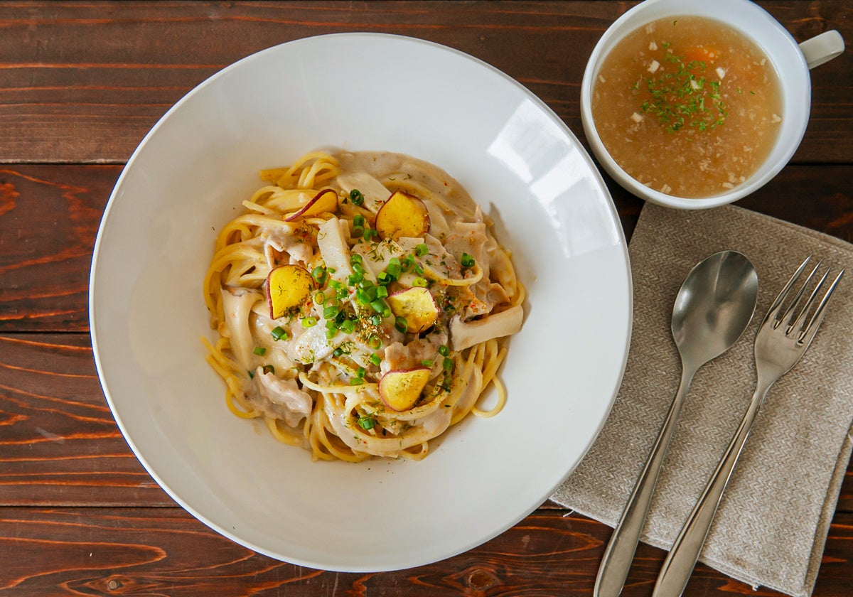 さつまいもときのこを使った、濃厚なクリームソースのパスタに、カリっと揚げたさつまいもチップスをトッピングしました。豚肉のうまみと、さつまいものやさしい甘さがまろやかなクリームソースに、ピリッと効いた自家製の四味とうがらしがアクセントに。
