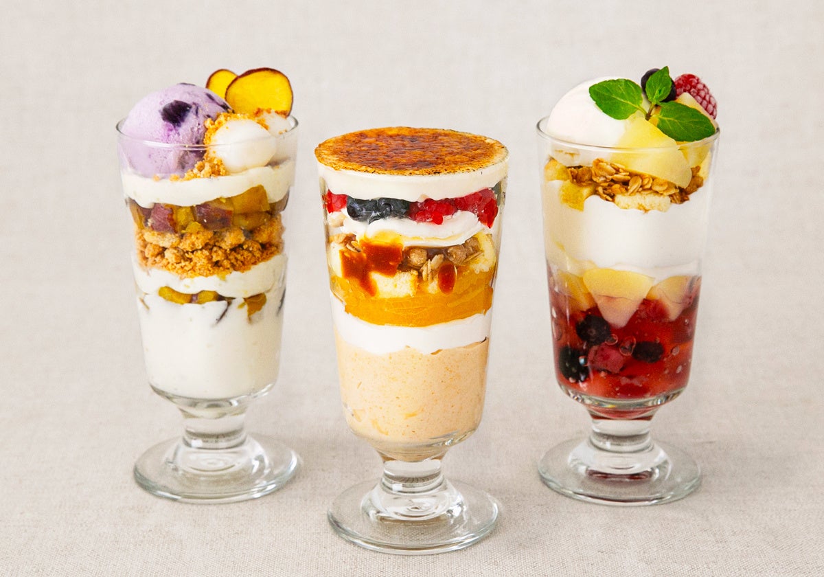 「さつまいもと白ごまのパフェ」は、茨城県産のさつまいも「シルクスイート」をたっぷり使用した、なめらかなクリームと白ごまの香るクランブルが相性抜群です。クレームブリュレ風に仕上げた「りんごと塩キャラメルのブリュレパフェ」は、表面のキャラメリゼを割ると、りんごのコンポートとほろ苦い塩キャラメルのムースが出てきます。フロマージュブランに、洋なしとさわやかなベリージュレを合わせた「洋なしとベリーのパフェ」は、フルーツたっぷりの甘酸っぱい秋パフェです。