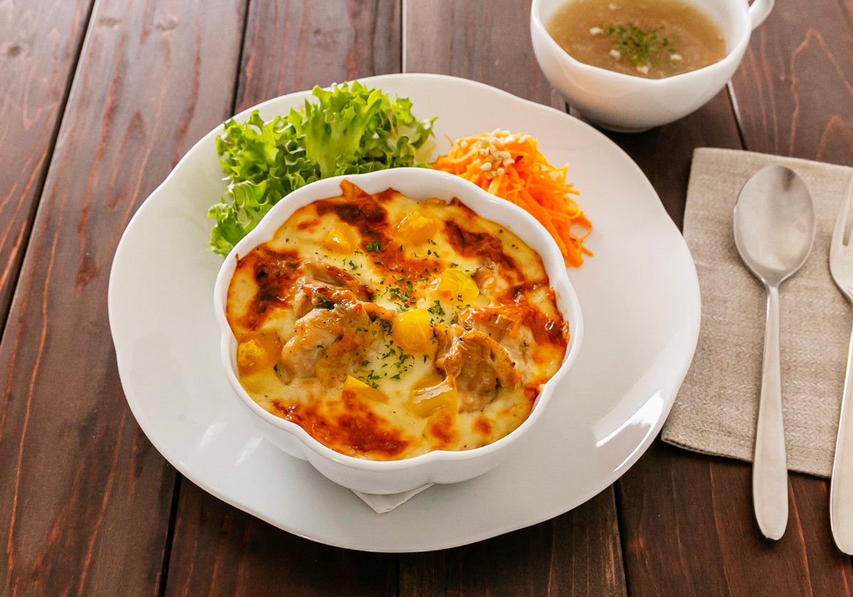 熊本県産の栗の甘露煮を使用した、ほんのり甘みのある栗のホワイトソースに、鶏ごぼうごはんを合わせ、チーズをかけて香ばしく焼き上げました。和風のごはんに洋風なホワイトソースが絶妙な相性です。